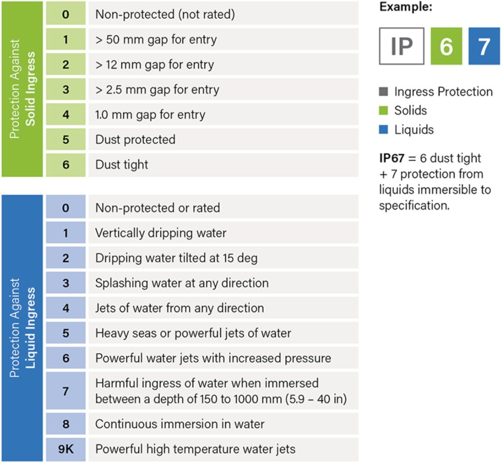 Defines resistance to water and solid particle intrusion. Examples include: