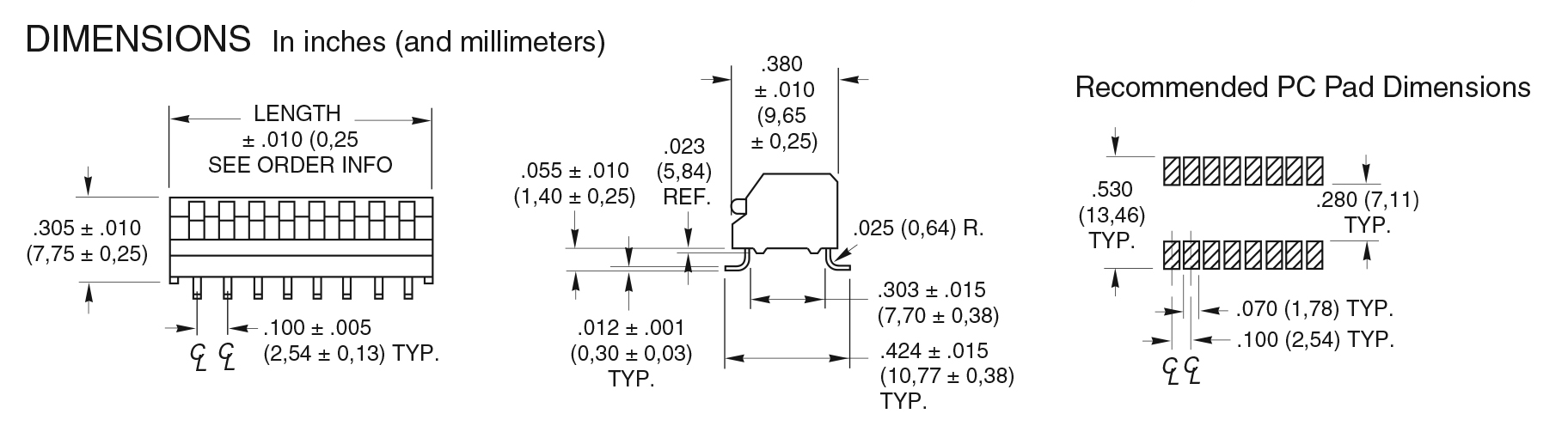 Switch Type: Piano-DIP Circuitry: SPST Mounting Configuration: Surface Mount Switch Rating: 50 mA at 30 VDC |