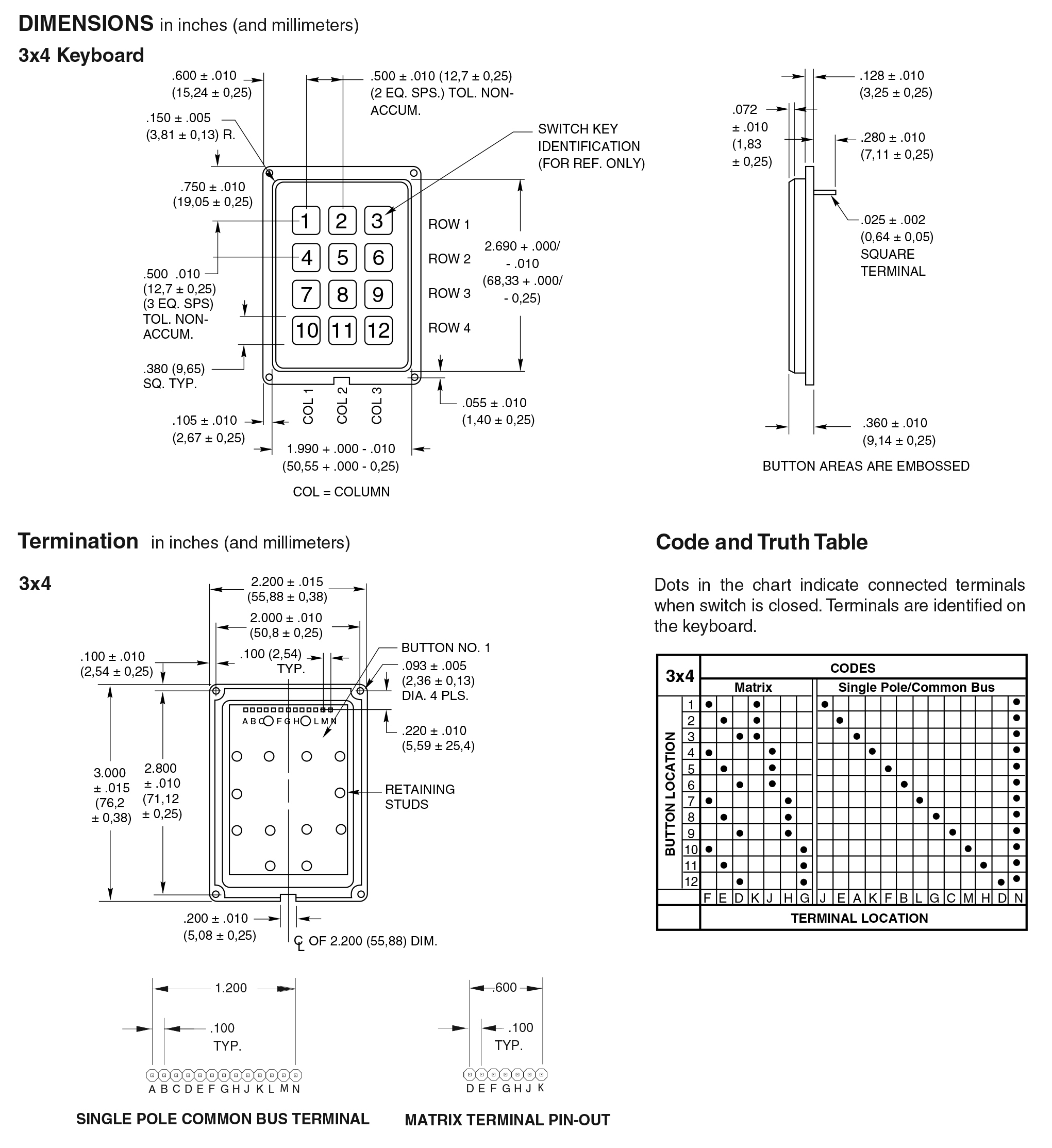Configurations: 3x4 Circuitry: 2 of 7 Code Maximum Switch Rating: 10 mA Mechanical Life Cycles: 3M |