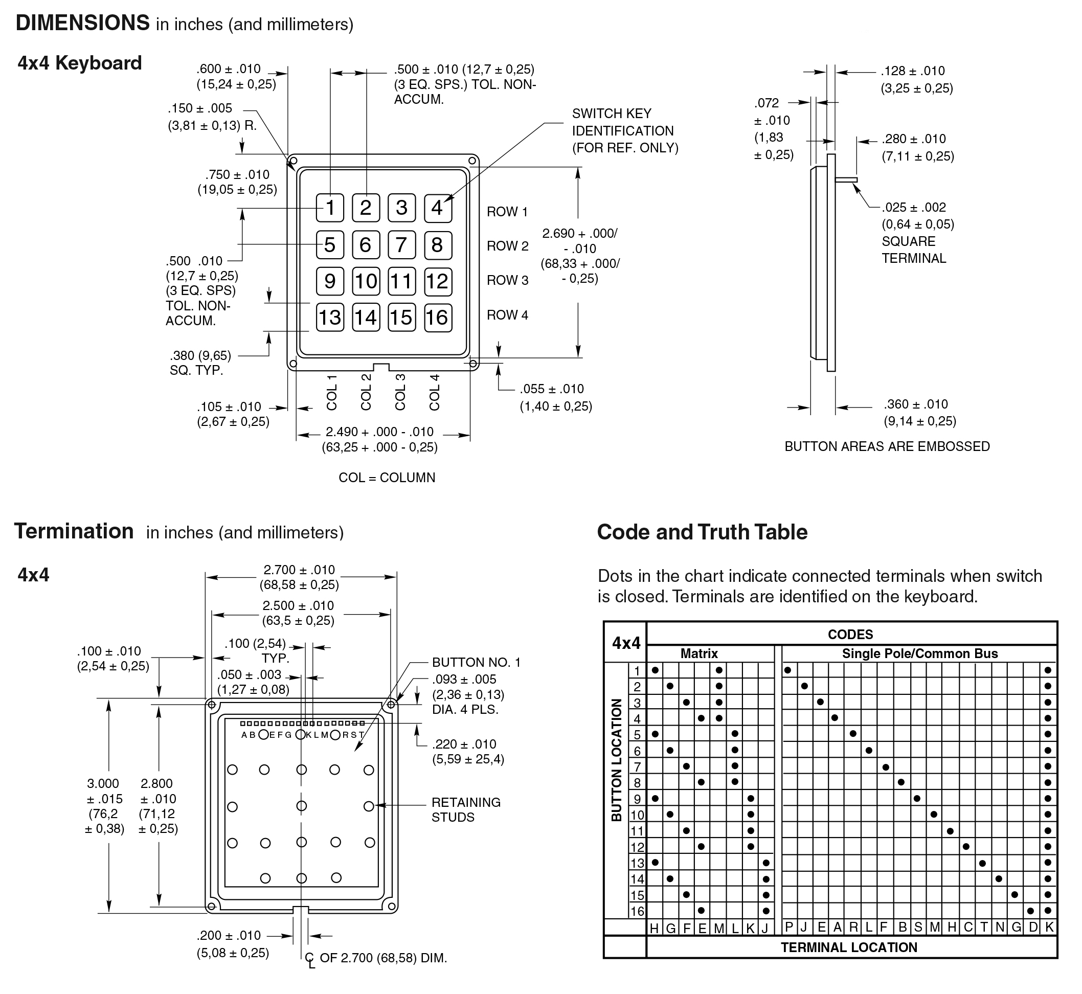 Configurations: 4x4 Circuitry: 2 of 8 Code Maximum Switch Rating: 10 mA Mechanical Life Cycles: 3M |