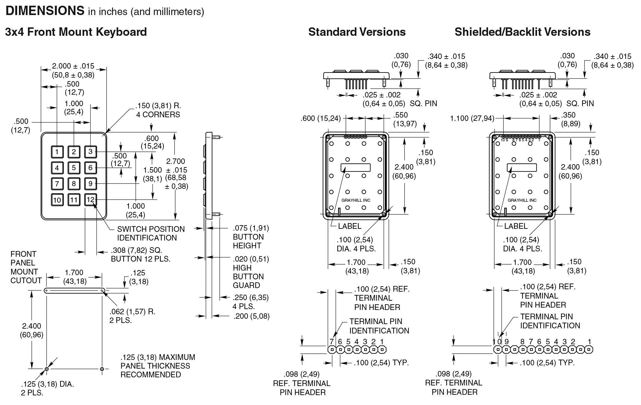 Grayhill offers a comprehensive range of customizable keypads. Our standard configurations include sealed rubber keypads, vandal-resistant metallic constructions, and options for low-profile or full-travel actuation keypads. We provide various switching technologies, including conductive rubber and metal dome contacts. Options for outputs include matrix output and single pole/common bus. All keypads can be customized with unique legends, and many models feature backlit keys. When integrating a keypad technology into a custom front panel assembly, we can tailor the keypad shape to meet the specific requirements of your application. Customization can include: