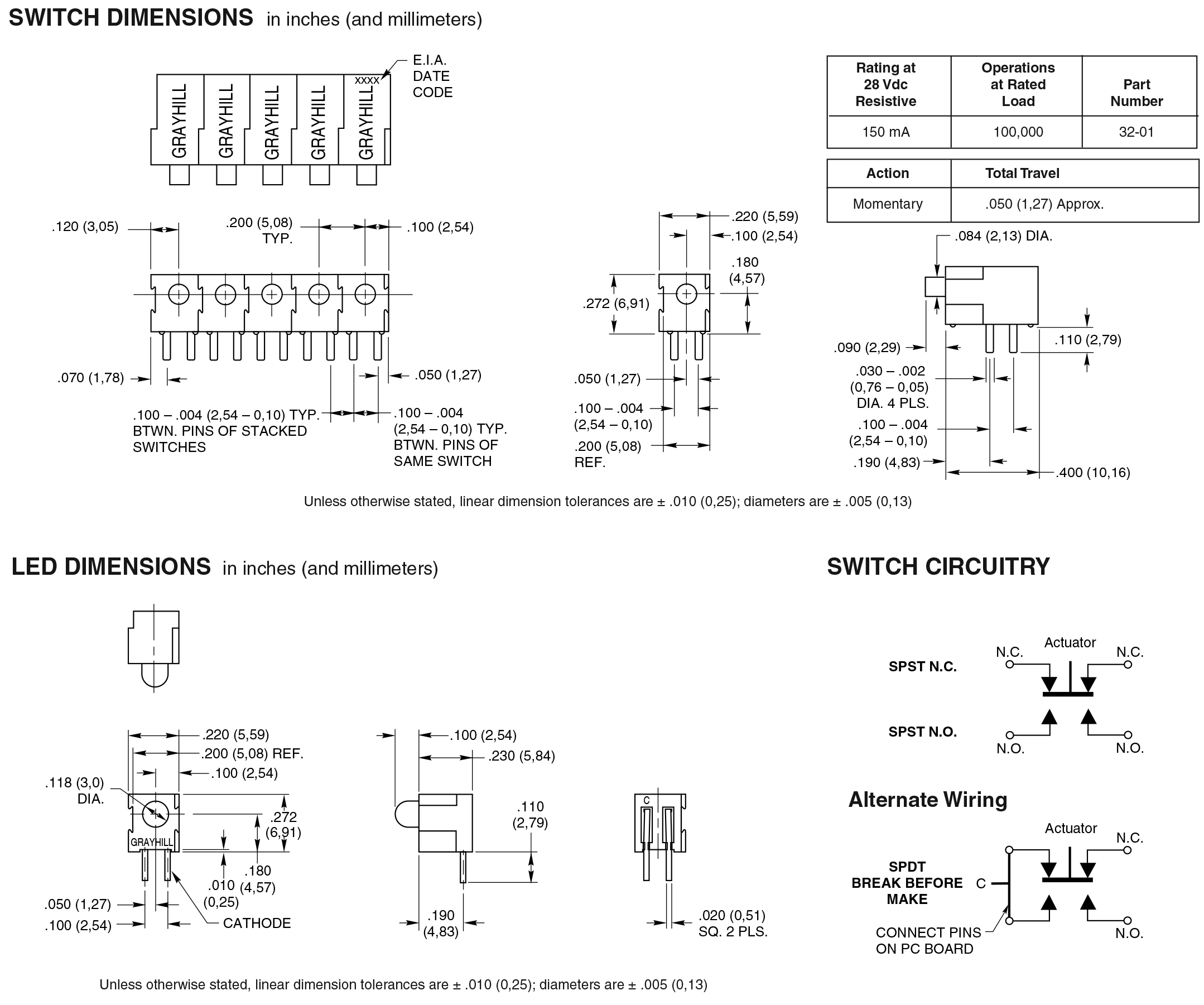 Contact Type: Butt Contact Circuitry: SPDT - N.C. Max Switch Rating: 2 mA Mechanical Life Cycles: 100000 |