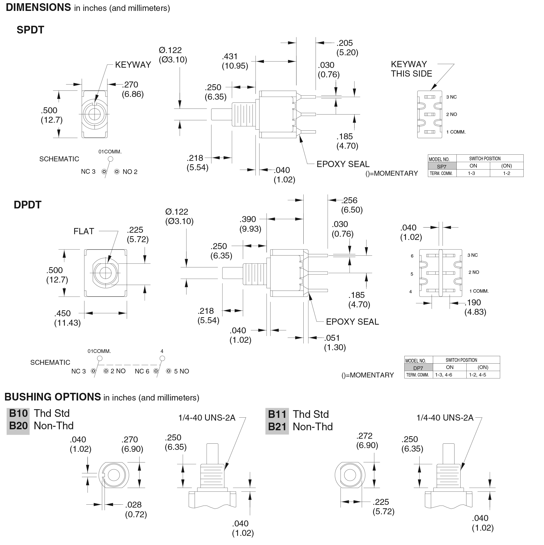 • Behind Panel Depth Inches [mm]: SPDT .431 [10, 95], DPDT .390 [9, 93]