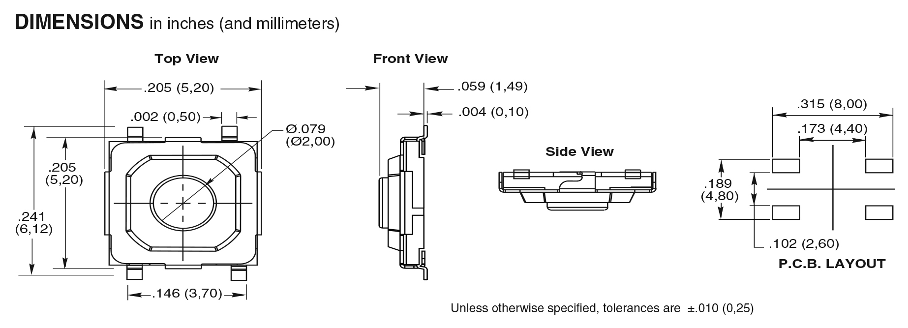 Switch Style: SMT Electrical Rating: 50 mA, 12 VDC 3D Model Available: Yes Washable: Yes |